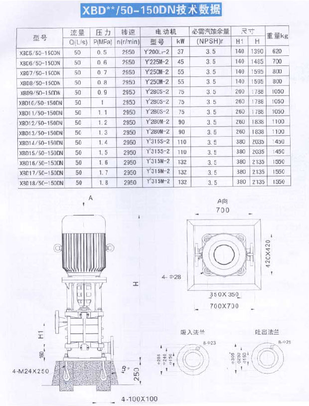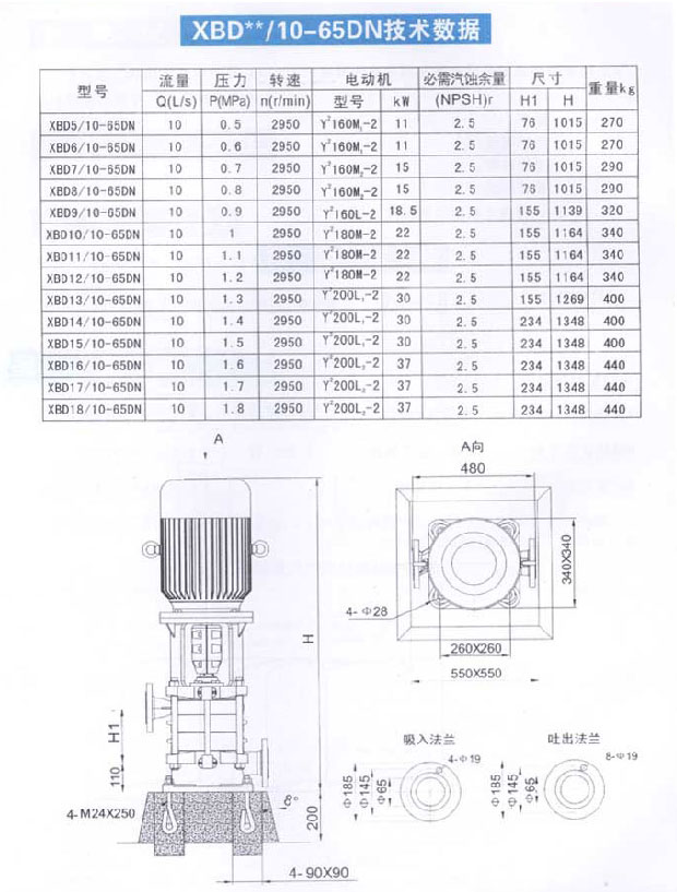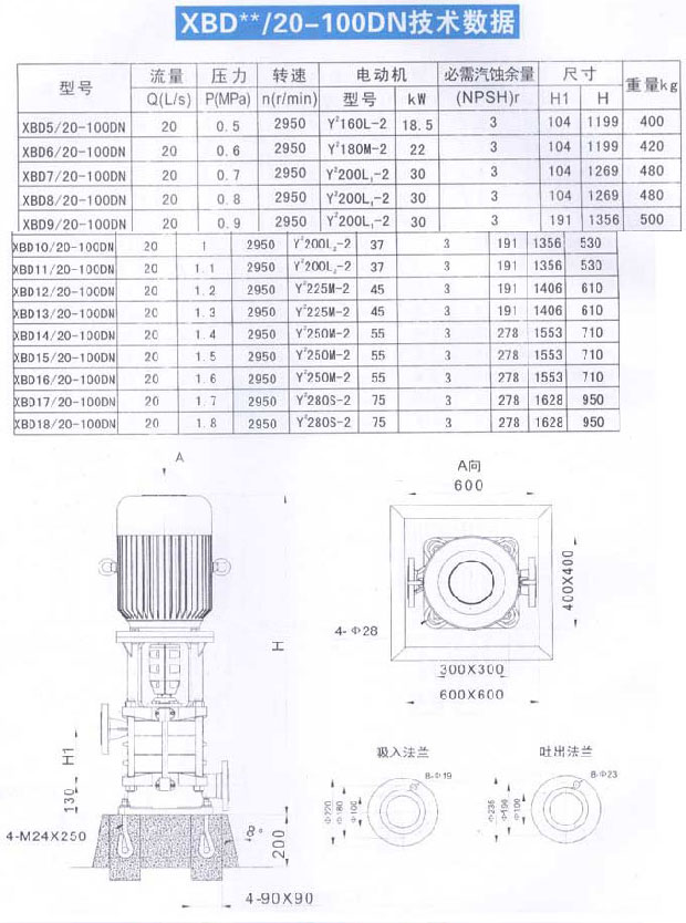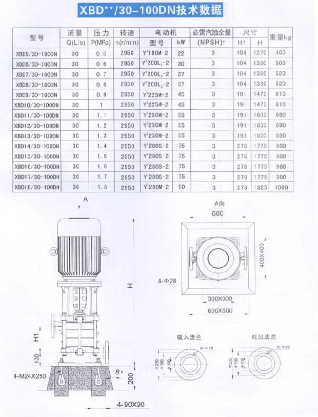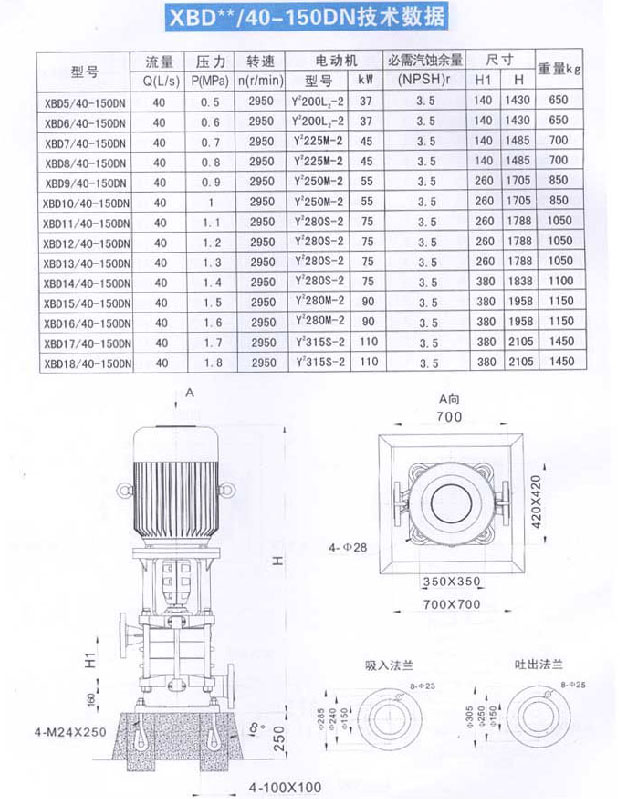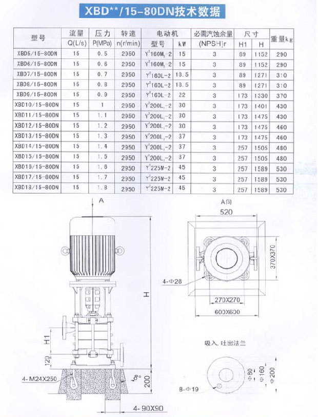 XBD-DN係列(liè)多級離心消防泵,其進出口法蘭的方向(xiàng),可按需要相對於吸入口方向成90°,180°,270°(不允許0度)。